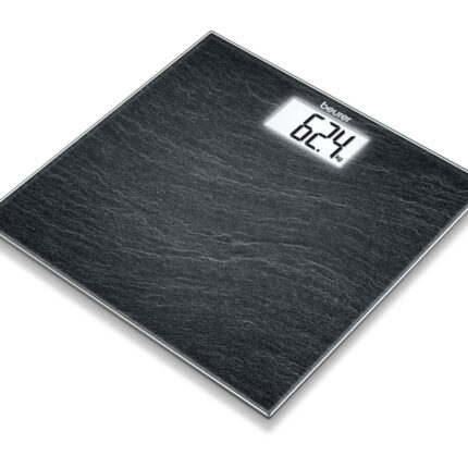 משקל אדם Beurer GS203 SLATE – עיצוב מודרני עם זכוכית מודפסת אבן צפחה, דיוק ואמינות במדידה.