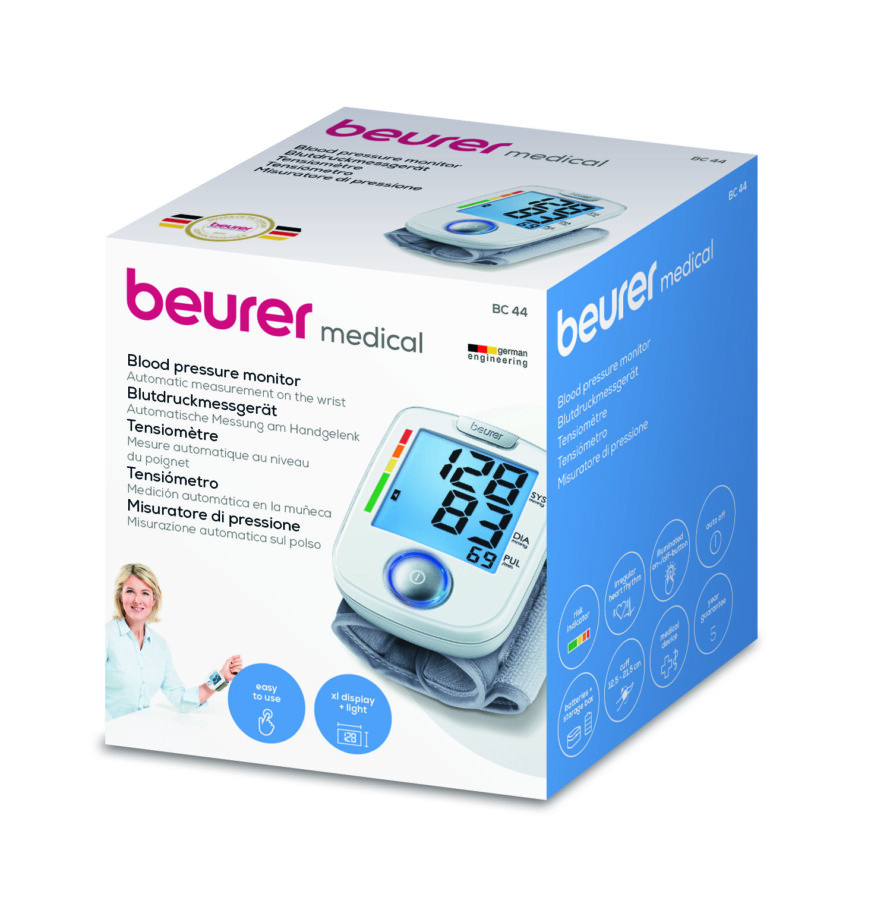 מד לחץ דם Beurer BC44 למדידה קלה ונוחה בפרק כף היד – עם תצוגה ברורה ואוטומטית.